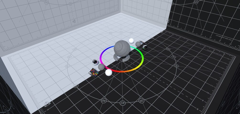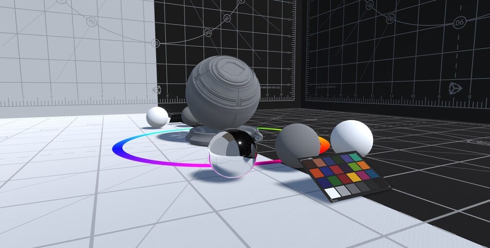 This version of the scene is built in the standard renderer so you can upgrade it to URP or HDRP as needed and features useful testing objects like reflection spheres and a color tester panel.